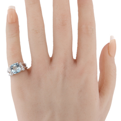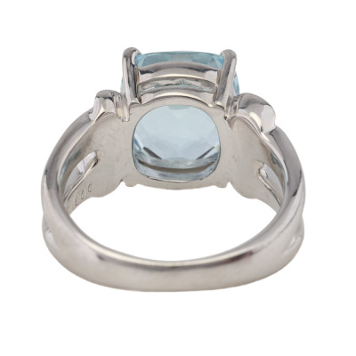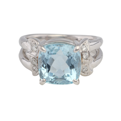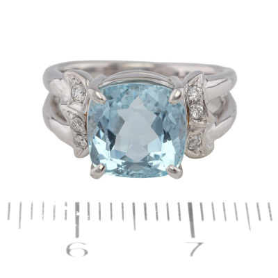 Aquamarine & Diamond Ring with a cushion cut Natural Aquamarine of 3.35ct and 6 round Natural Diamonds totalling 0.08ct. Platinum - 900. Ring size I. Band width: 2.5mm-6.0mm. Weight: 9.2g..