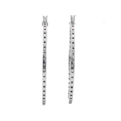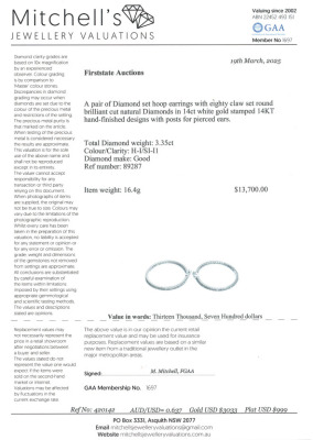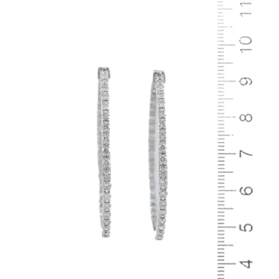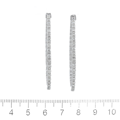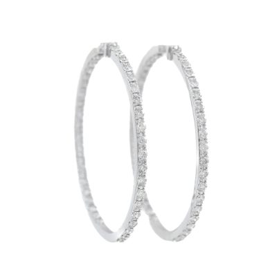 Inside out hoop earrings with 80 round Natural Diamonds totalling 3.35ct (Estimated grading: H-I SI-P1). Each earring set with 20 Diamonds inside and 20 Diamonds outside the hoop. 14ct white gold. Hoop diameter: 4.7cm. Hoop width: 2.3mm. Weight: 16.4g. With Valuation Certificate #420142. (New).