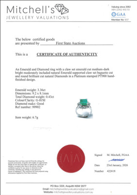 Emerald and Diamond ring with centre emerald cut Natural Emerald of 3.36ct with round & baguette cut Natural Diamonds totalling 0.43ct (Estimated grading: GH SI). Platinum - 900. Ring size: M3/4. Band width: 2.8mm - 3.6mm. Weight: 6.7g. With Certificate #422418.