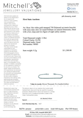 Diamond tennis bracelet with 69 round Natural Diamonds totalling 3.38ct (Estimated grading: HI SI). 18ct white gold. Length: 18cm. Weight: 8.2g. With Valuation Certificate #422323.