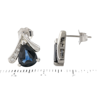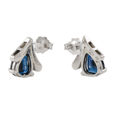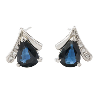 Sapphire and Diamond earrings with pear shape Natural blue Sapphires totalling 3.39ct and round Natural Diamonds totalling 0.04ct. Platinum - 900 with 18ct white gold backs. Weight: 4.7g. (Pre-owned)