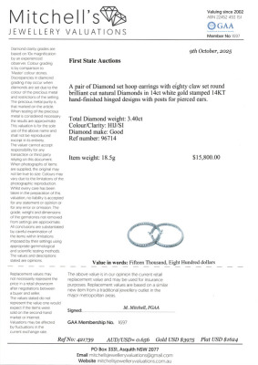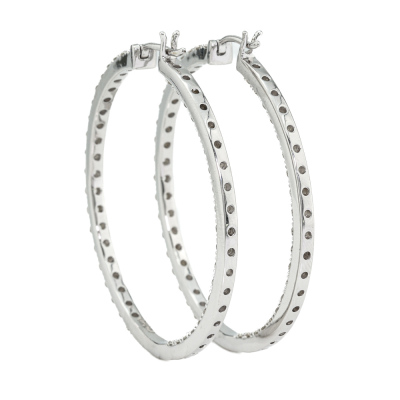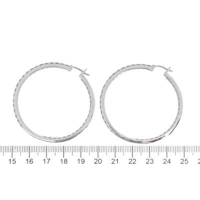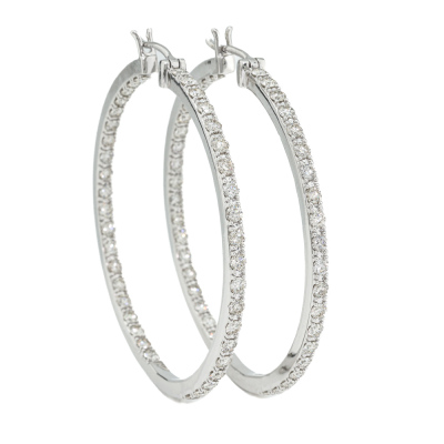 Inside out hoop earrings with 80 round Natural Diamonds totalling 3.40ct (Estimated grading: HIJ SI). Each earring set with 20 Diamonds inside and 20 Diamonds outside the hoop. 14ct white gold. Hoop diameter: 4.8cm. Hoop width: 2.2mm. Weight: 18.5g. With Valuation Certificate #421739. (New)