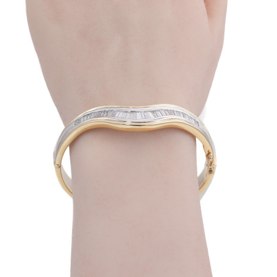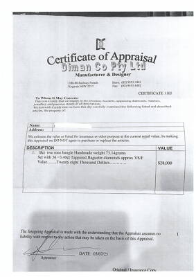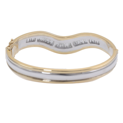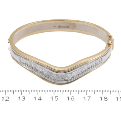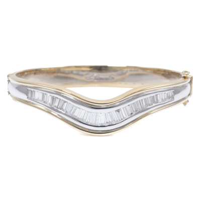 Hinged Diamond bangle with baguette cut Natural Diamonds totalling 3.40ct (Estimated grading: F VS). Solid 18ct white gold. Oval shape, inner circumference: 17.5cm. Width: 8.8mm - 12.2mm. Weight: 72.6g. With copy of Certificate of Appraisal dated 03/07/25. (Pre-owned)