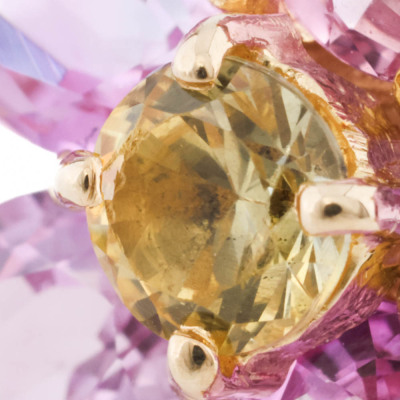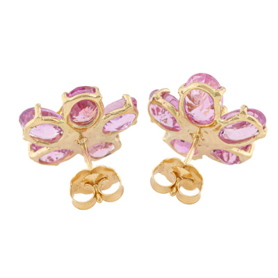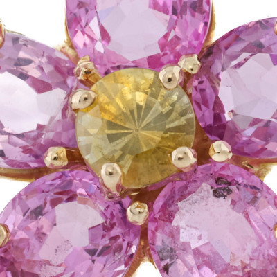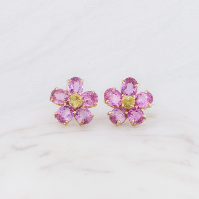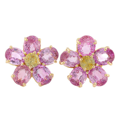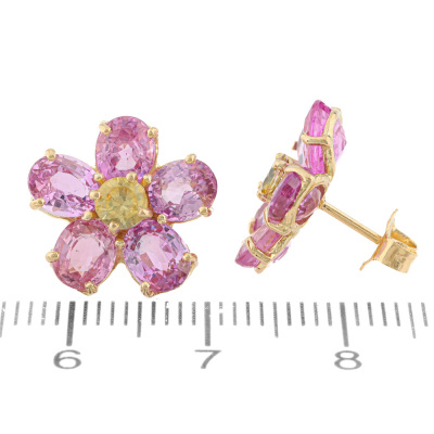 Flora design earrings with 10 oval Natural Pink Sapphires totalling approximately 3.00ct and 2 round Natural Yellow Sapphires totalling approximately 0.40ct. 18ct yellow gold. Weight: 4.0g. (As New).