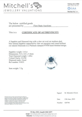 Sapphire and Diamond ring with oval round shape Natural Blue Sapphire of 3.41ct and round Natural Diamonds totalling 1.69ct (Estimated grading: H-I SI). Platinum - 950. Ring size L. Band width: 2.4mm - 2.3mm. Weight: 7.5g. With Certificate #420746. (Pre-owned)