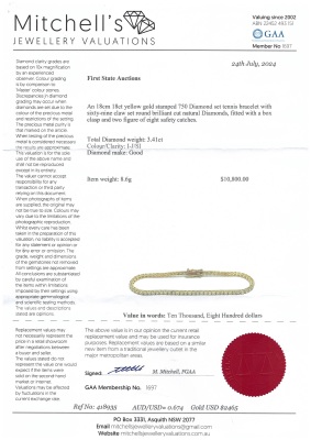 Diamond tennis bracelet with 69 round Natural Diamonds Totalling 3.41ct (Estimated grading: I-J SI). 18ct yellow gold. Length: 18cm. Weight: 8.6g. With Valuation Certificate #418935. (Pre-owned)