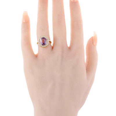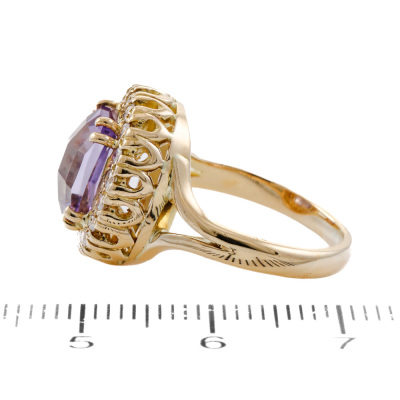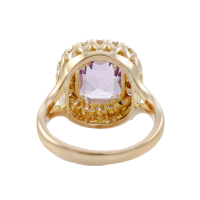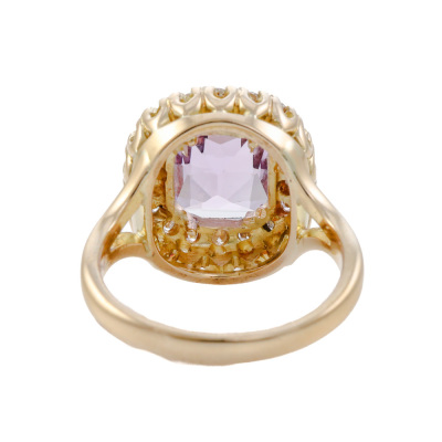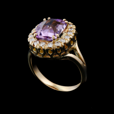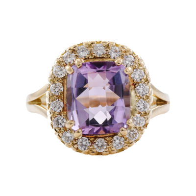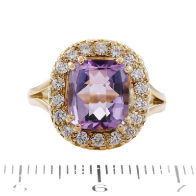 Amethyst and Diamond ring with centre checkerboard cushion cut Natural Amethyst of approximately 3.43ct and round Natural Diamonds totalling approximately 0.36ct (Estimated grading: G-H VS-SI). 18ct yellow gold. Ring size J. Band width: 2.4mm - 2.7mm. Weight: 7.0g. (Pre-owned).