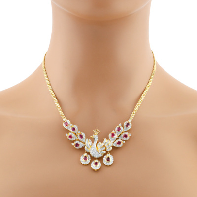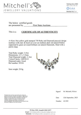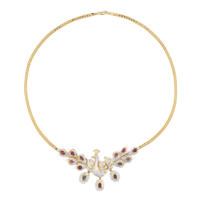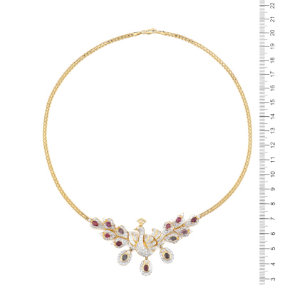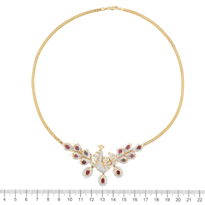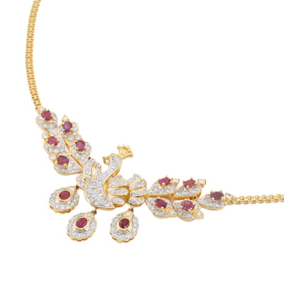 Peacock design necklace with oval shape Natural Rubies totalling 3.43ct and round Natural Diamonds totalling 2.16ct (Estimated grading: GHI SI-P1). 18ct yellow gold. Length: 45cm. Weight: 29.8g. With Certificate #421505. (Pre-owned)