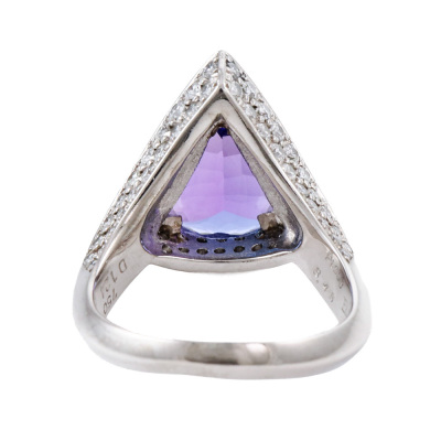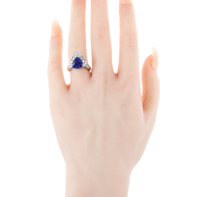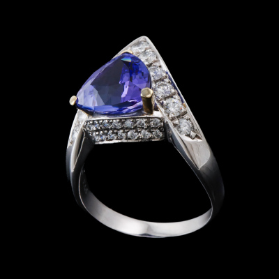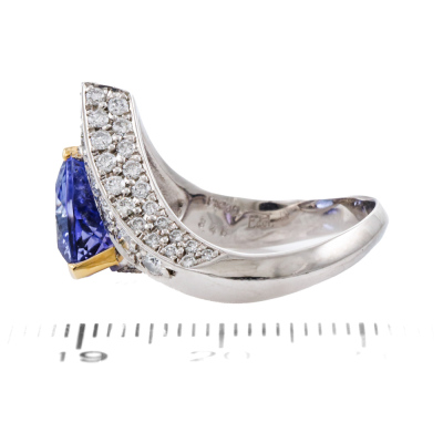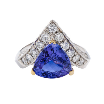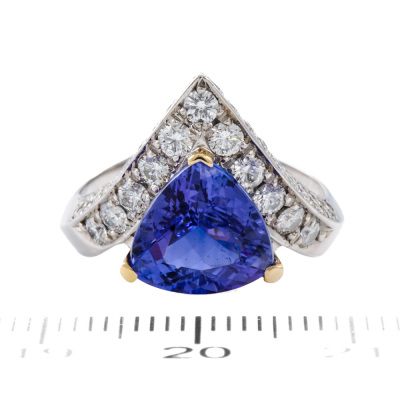 Tanzanite and Diamond ring with Trilliant cut natural Tanzanite of 3.46ct and round natural Diamonds totalling 1.24ct (Estimated grading: G-H SI). Platinum - 900 and 18ct yellow gold. Band width: 2.8mm - 4.5mm