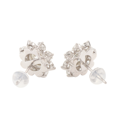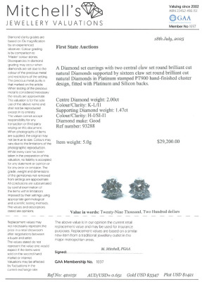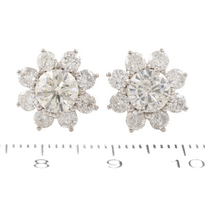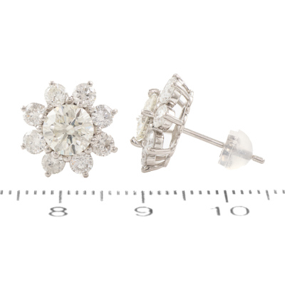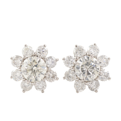 Diamond earrings with Natural Diamonds totalling 3.47ct. With 2 centre round Natural Diamonds approximately 2.00ct (Estimated grading: K-L P1) and surrounding round Natural Diamonds totalling 1.47ct (Estimated grading: H-I SI-P1). Platinum - 900 with platinum 900 and silicon backs. Weight: 5.0g. With Valuation Certificate #421031. (Pre-owned)