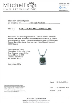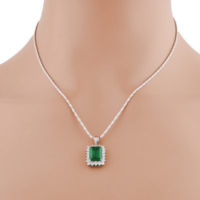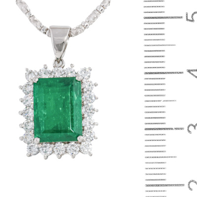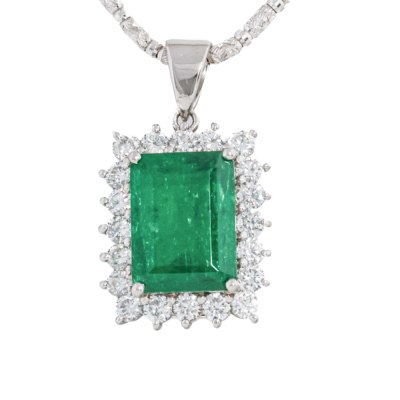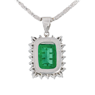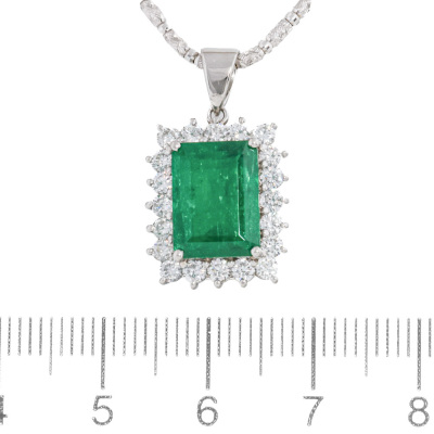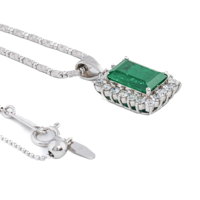 Emerald and Diamond pendant with an emerald cut Natural Emerald of 3.47ct and round Natural Diamonds totalling 1.05ct (Estimated grading: G-H SI). Platinum - 900 with 18ct white gold adjustable 44cm chain. Weight: 12.4g. With Certificate #421435. (Pre-owned)