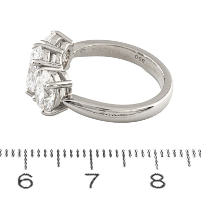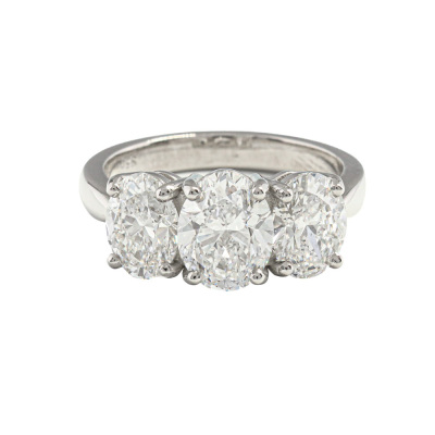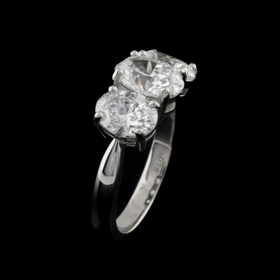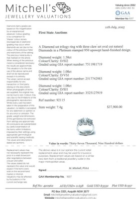 Diamond trilogy ring with centre oval shape Natural Diamond of 1.50ct (with GIA Report graded as D SI2 #7511981719) and 2 shoulder oval Natural Diamonds totalling 2.00ct (with GIA Reports graded as D VS1 #2517742983, D SI1 #3525127919). Platinum - 950. Ring size: L. Band width: 1.9mm - 2.7mm. Weight: 7.4g. With Valuation Certificate # 420962 (New)