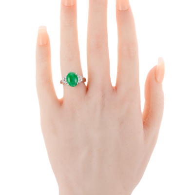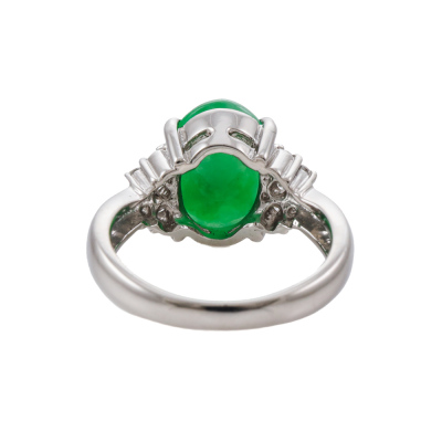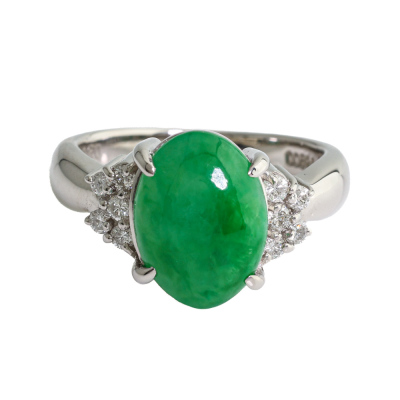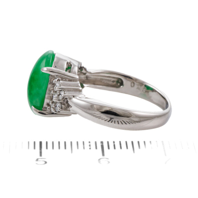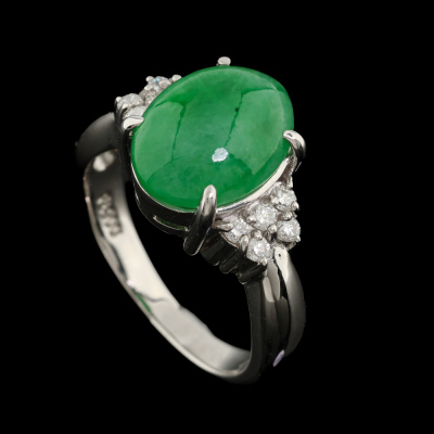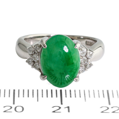 Jade and Diamond ring with oval cabochon cut Natural green Jadeite Jade - Type A of approximately 3.50ct and round Natural Diamonds totalling 0.20ct. Platinum - 900. Ring size K 1/2. Band width: 2.4mm - 4.0mm. Weight: 7.9g. (Pre-owned)