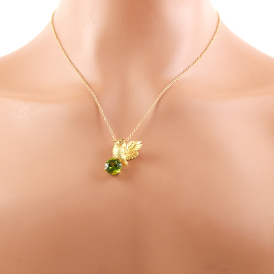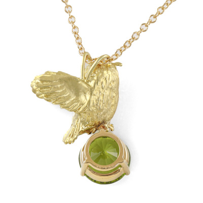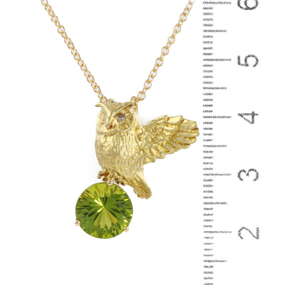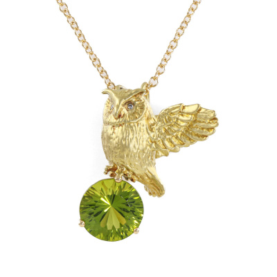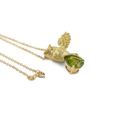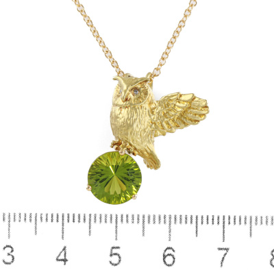 Owl design Pendant with round Natural Peridot of 3.50ct and 2 round Natural Diamonds totalling 0.01ct. 18ct yellow gold with 45cm 18ct yellow gold chain. 10.4g (Pre-Owned)