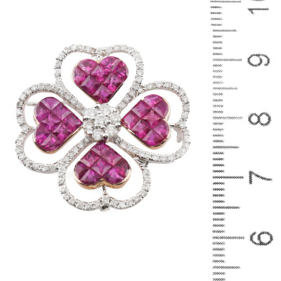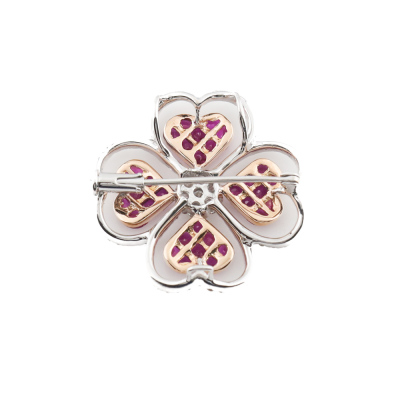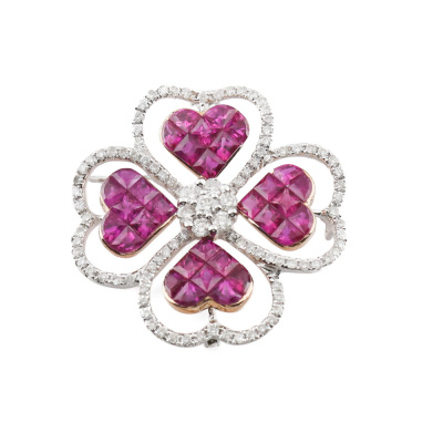 Ruby and Diamond brooch/pendant with carre & fan cut Natural Rubies totalling 3.50ct and round Natural Diamonds totalling 0.85ct (Estimated grading: H-I SI-P1). 18ct white and rose gold. Weight: 6.2g. (Pre-owned)