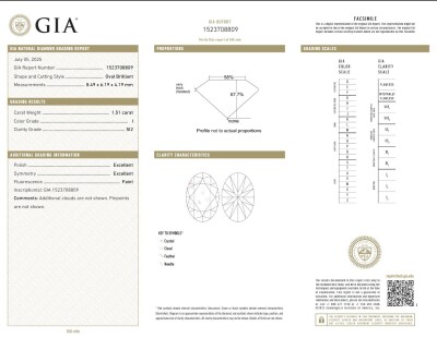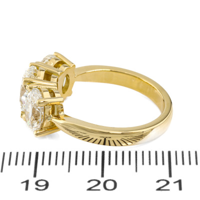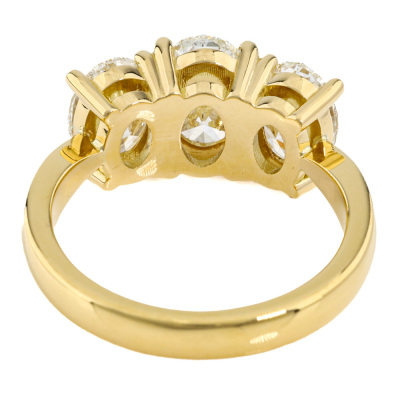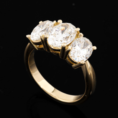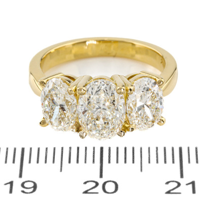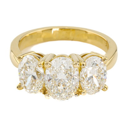 Diamond trilogy ring with centre oval shape Natural Diamond of 1.51ct (with GIA Report graded as I SI2 #1523708809) and 2 shoulder oval Natural Diamonds totalling 2.00ct (with GIA Reports graded as I SI1 #1232658186 & H SI2 #7526194215). 18ct yellow gold. Ring size L. Band width: 2.8mm. Weight 6.2g.