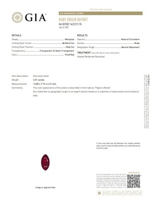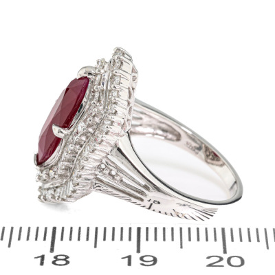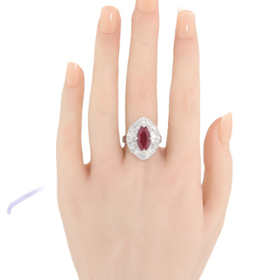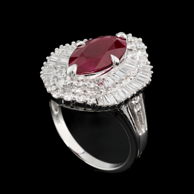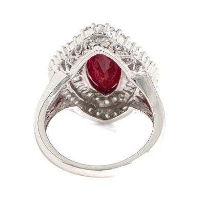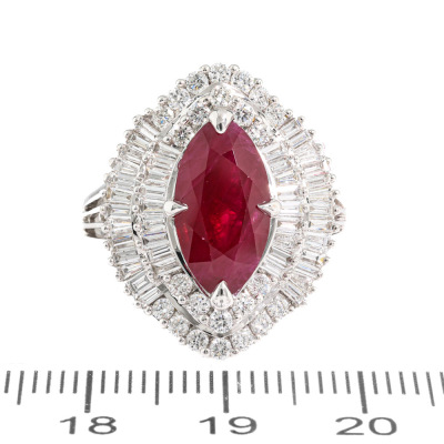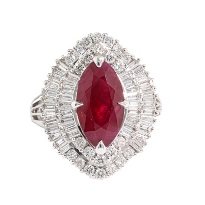 Ruby and Diamond ring with marquise cut Pigeon's Bood Natural Burmess Ruby of 3.51ct (With GIA Report #3435731178) and round & baguette cut Natural Diamonds totalling approximately 1.73ct (Estimated grading G-H SI). 18ct white gold. Ring size: M1/2. band width: 2mm - 3.6mm. Weight: 7.6g. (Pre-owned)