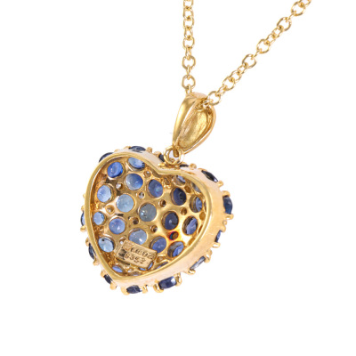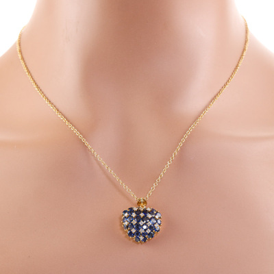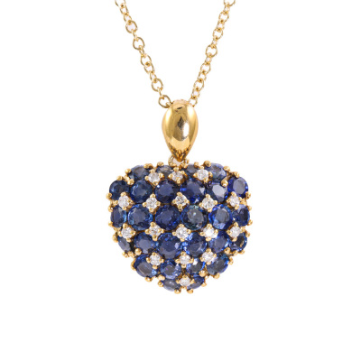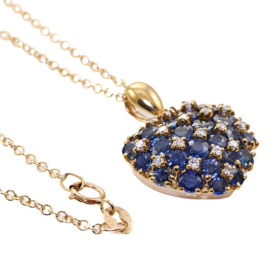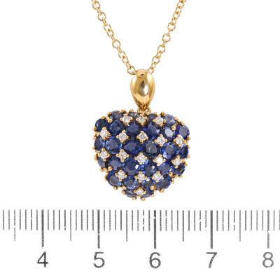 Sapphire and Diamond pendant with round Natural Blue Sapphires totalling 3.52ct and round Natural Diamonds totalling 0.22ct. 18ct yellow gold with 44.5cm 18ct yellow gold chain. Weight: 7.4g. (pre-owned)
