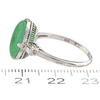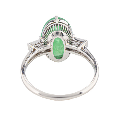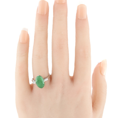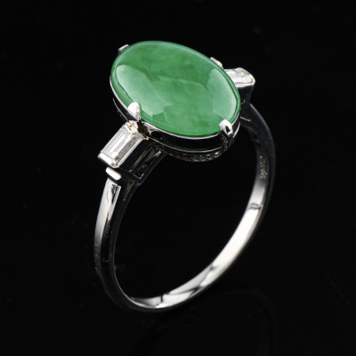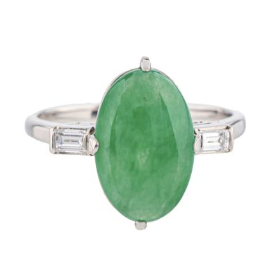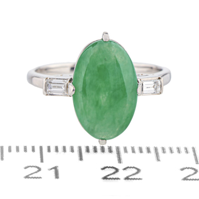 Jade and Diamond ring with marquise shape cabochon cut Natural Green Jadeite Jade - Type A of 3.54ct and 2 baguette cut Natural Diamonds totalling approx. 0.12ct (Estimated grading: G VS-SI). Platinum-850 (not stamped -XRF tested). Ring size: N½. Band width: 1.9mm - 1.6mm. Weight: 4.5g.