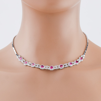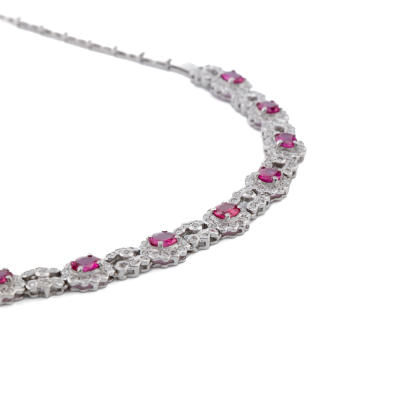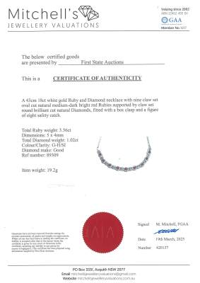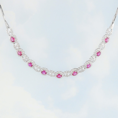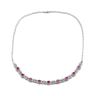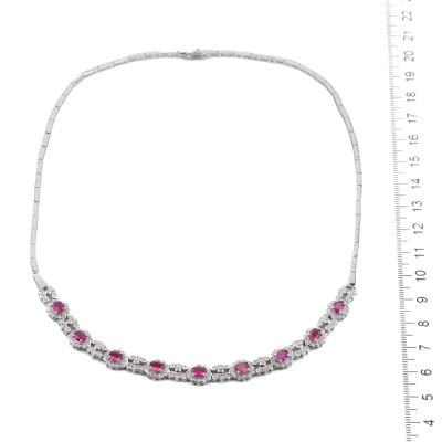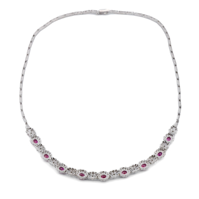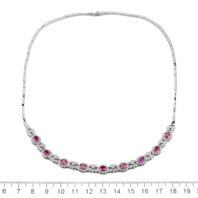 Ruby and Diamond necklace with 9 oval shape Natural Rubies totalling 3.56ct and round Natural Diamonds totalling 1.02ct (Estimated grading: I-J SI). 18ct white gold. Length: 43cm. Weight: 19.2g. With Certificate #410137. (Pre-owned)