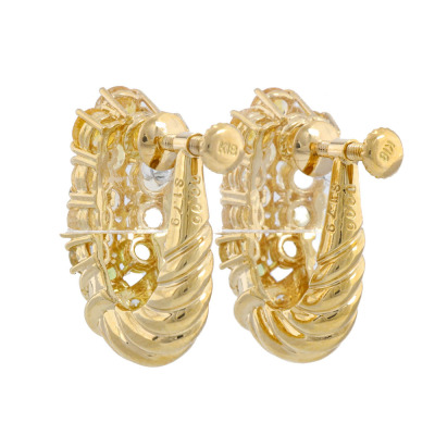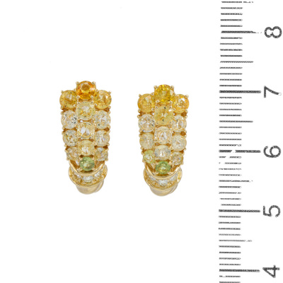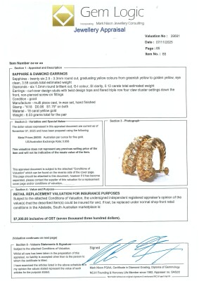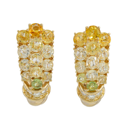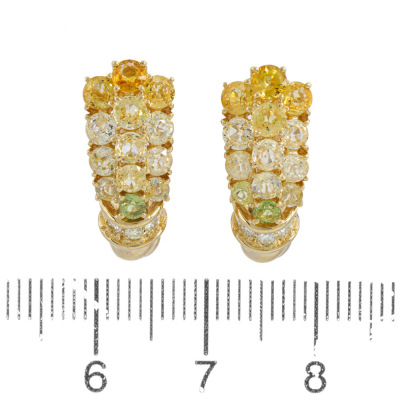 Sapphire and Diamond screwback earrings (for non-pierced ears) with round Natural yellow & light green Sapphires totalling 3.58ct and round Natural Diamonds totalling 0.12ct. 18ct yellow gold. Dimensions: 2cm x 0.8cm. Weight: 8g. With Valuation Certificate dated 07/11/25. (Pre-owned