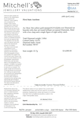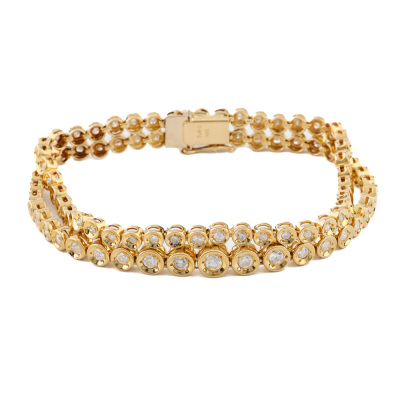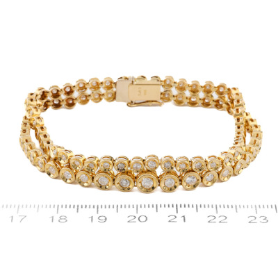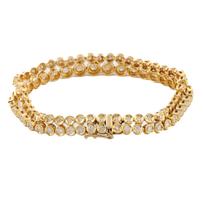 Diamond 2 row tennis bracelet with 90 round Natural Diamonds totalling 3.60ct (Estimated grading: I-J P1). Note - one row is slightly graduated in size. 18ct yellow gold. Length: 19cm. Weight: 22.7g. With Certificate #420490. (Pre-owned)