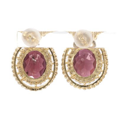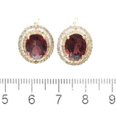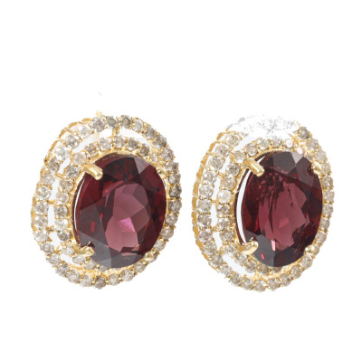 Garnet and Diamond earrings with oval Rhodolite Natural Garnet totalling 3.60ct and round Natural Diamonds totalling 0.40ct (Estimated grading: I-J P1-P2). 18ct yellow gold with 18ct yellow gold & silicon backs. Weight: 4.4g. (Pre-owned)