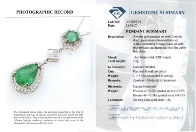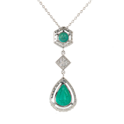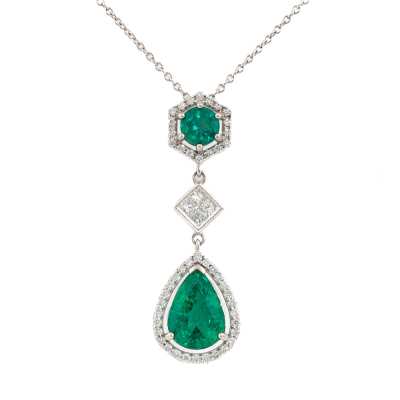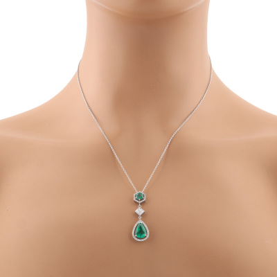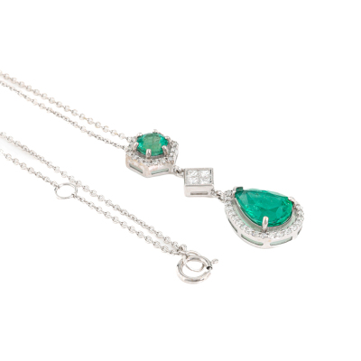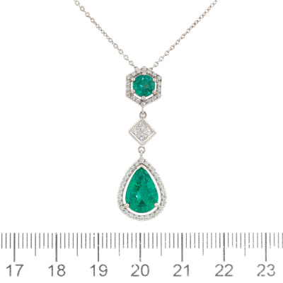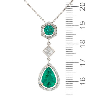 Emerald and Diamond pendant with round & pear shape Natural Zambian Emeralds totalling 3.63ct and round & princess cut Natural Diamonds totalling 0.61ct (Estimated grading: G-H VS). 18ct white gold with 42.5cm - 45.5cm 18ct white gold chain. Weight: 5.0g. With GSL Summary Report #AA70993/1. (As New)
