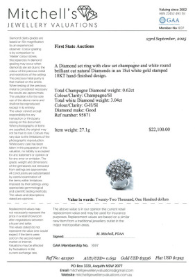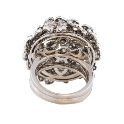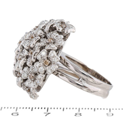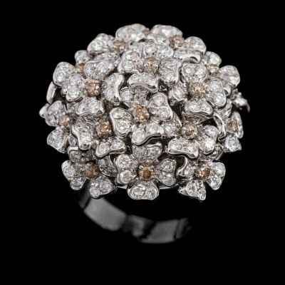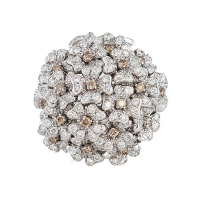 Diamond flower ring with round Natural Champagne Diamonds totalling 0.62ct (Estimated grading: Champagne SI) and round Natural Diamonds totalling 3.04ct (Estimated grading: G-H SI). 18ct white gold. Note: flower motifs are set to allow slight movement. Ring size: O 1/2. Band width: 4.5mm - 5.7mm. Weight: 27.1g. With Certificate #421590. (Pre-owned)