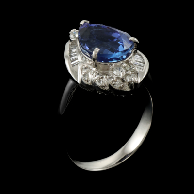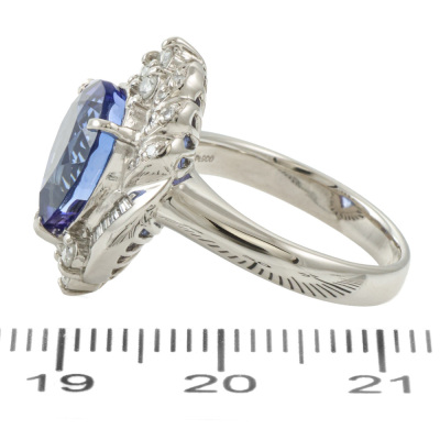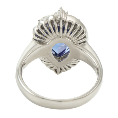 Tanzanite and Diamond ring with centre oval shape Natural Tanzanite of 3.67ct and round Natural Diamonds totalling 0.35ct (Estimated grading: G-H VS). Platinum - 900. Ring size I1/4. Band width: 2.6mm - 2.9mm. Weight: 8.6g