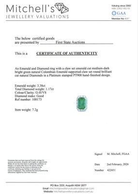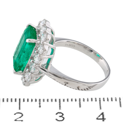 Emerald and Diamond ring with centre emerald cut Natural Colombian Emerald of 3.68ct and round Natural Diamonds totalling 1.17ct (Estimated grading: GH VS). Platinum - 900. Ring size K. Band width: 2.4mm - 2.3mm. Weight: 7.2g. With Certificate #422451. (As new)