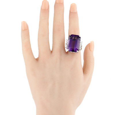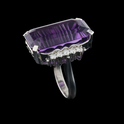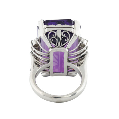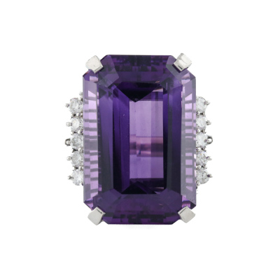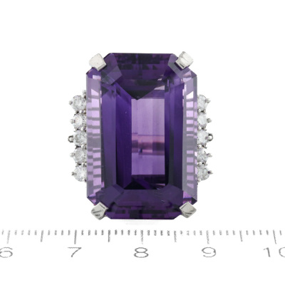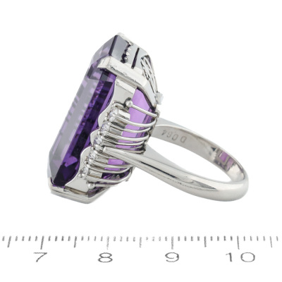 Amethyst and Diamond ring with centre emerald cut Natural Amethyst of 37.19ct and round Natural Diamonds totalling 0.64ct (Estimated grading: H SI). Platinum - 900. Ring size M. Band width: 3.2mm. Weight: 23.7g. (Pre-owned)