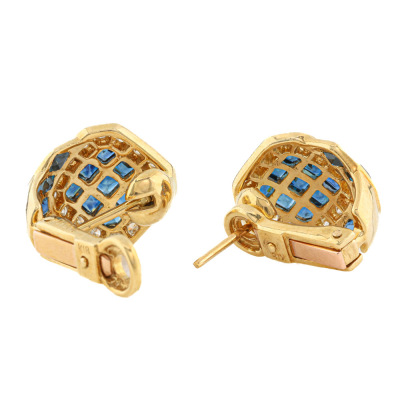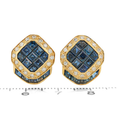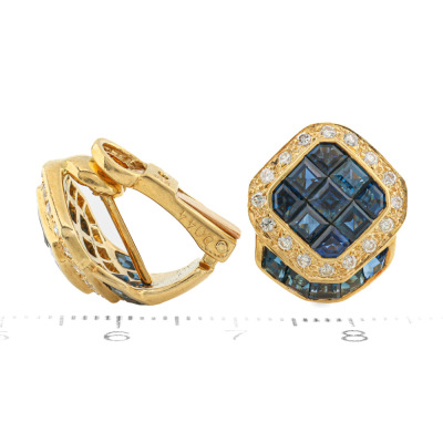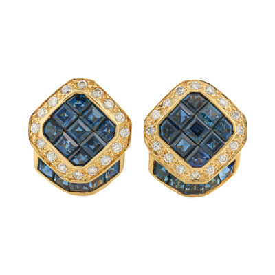 Sapphire and Diamond clip-on earrings (foldable posts to be worn for pierced and non pierced ears) with carre cut Natural Blue Sapphires totalling 3.71ct and round Natural Diamonds totalling 0.44ct (Estimated grading: H SI). 18ct yellow gold. Weight: 11.4g. (Pre-owned)