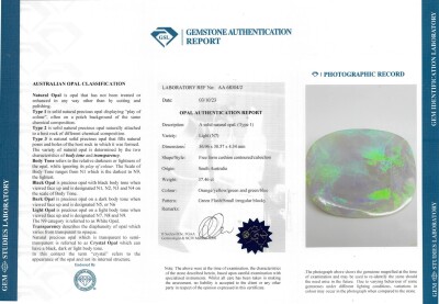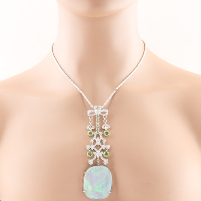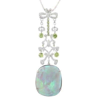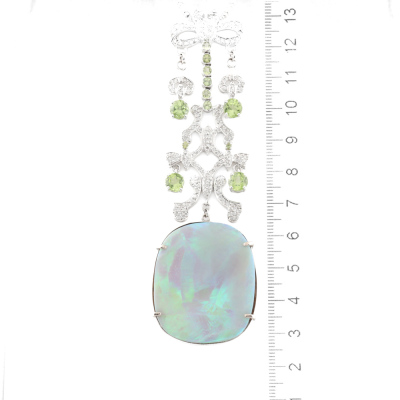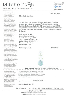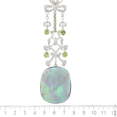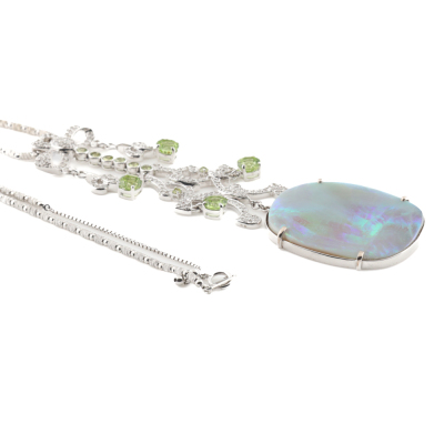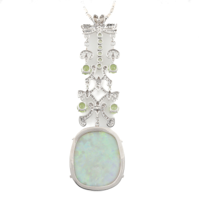 Opal, Peridot & Diamond necklace with freeform cabochon cut Solid Natural Light Opal of 37.46ct (With GSL Report #AA68304/2. Origin: South Australia), round Natural Peridots totalling approximately 4.00ct and round Natural Diamonds totalling 1.86ct (Estimated grading H-I SI-P1). 18ct white gold with 44.5cm 18ct white gold chain. Pendant drop length: 10.6cm. Weight: 33.0g. With Valuation Certificate #420635. (Pre-owned)