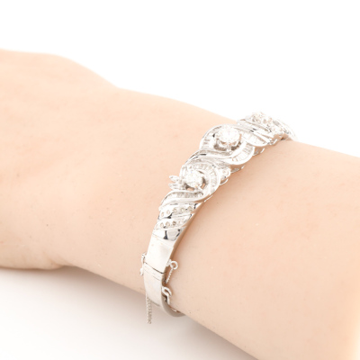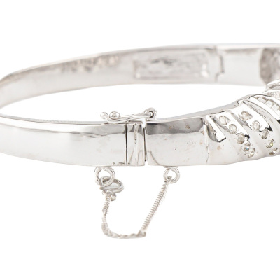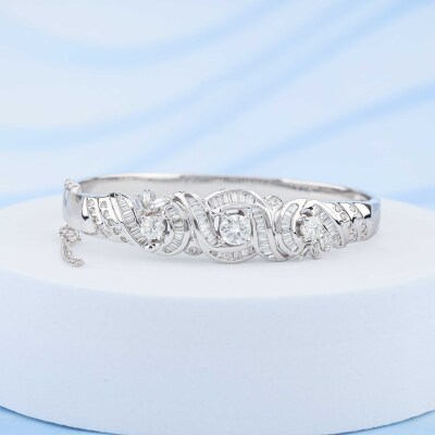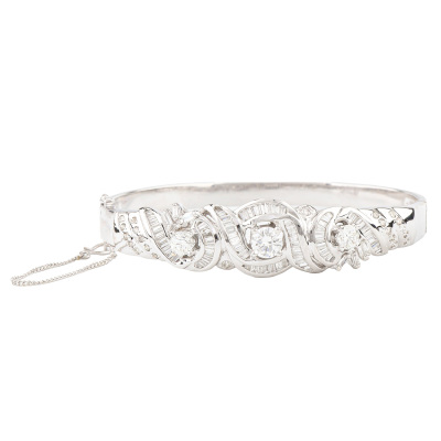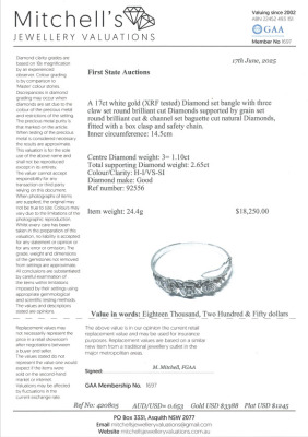 Diamond bangle with three top round Natural Diamonds totalling approximately 1.10ct and remaining baguette cut & round Natural Diamonds totalling approximately 2.65ct (Estimated grading: H-I VS-SI). 17ct white gold as XRF tested, no stamps, with safety chain. Circumference: approximately 14.5cm - small to petite size. Width: 4.5mm - 6.7mm. Weight: 24.4g. With Valuation Certificate #420805. (Pre-owned)