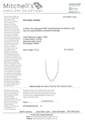 Diamond necklace with round Natural Diamonds totalling 3.80ct (Estimated grading: G-H SI). 18ct white gold. Length: 90cm. Weight: 19.1g. With Valuation Certificate #421635.