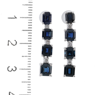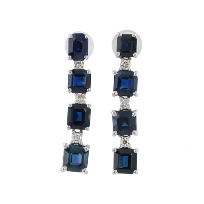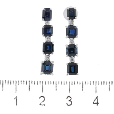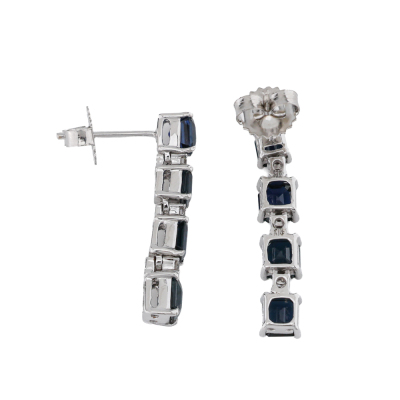 Sapphire and Diamond Earrings with emerald cut natural blue Sapphires totalling 3.83ct and round natural Diamonds totalling 0.16ct. 18ct white gold with 18ct white gold backs. Length: 2.5cm. Weight: 4.5g. (pre-owned)