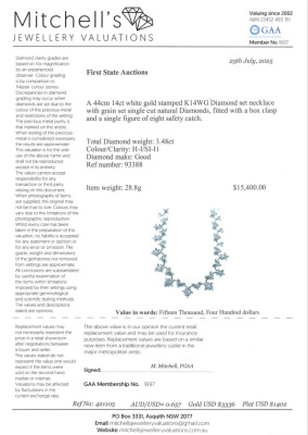Diamond necklace with round Natural Diamonds totalling 3.84ct (Estimated grading: H-I SI-P1). 14ct white gold. Length: 44cm. Weight: 28.8g. With Certificate #421105. (Pre-owned)