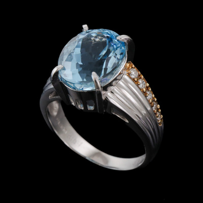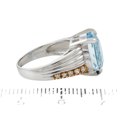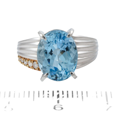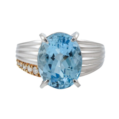 Aquamarine and Diamond ring with centre oval shape Natural Aquamarine of 3.86ct and 5 round Natural Diamonds totalling 0.06ct. Platinum - 900 and 18ct yellow gold plating. Band width: 2.5mm - 6.5mm