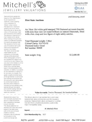 Diamond tennis bracelet with 64 round Natural Diamonds totalling 3.86ct (Estimated grading: HI VS-SI). 18ct white gold. Length: 18cm. Weight: 8.6g. With Valuation Certificate #422287.