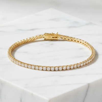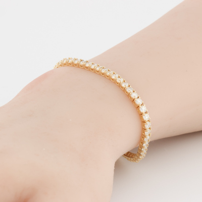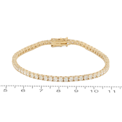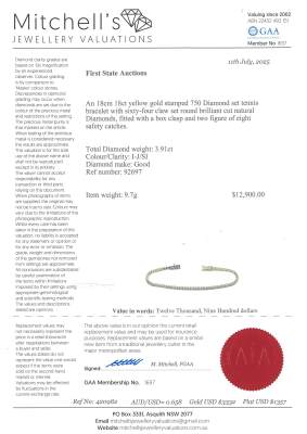 Diamond tennis bracelet with 64 round Natural Diamonds totalling 3.91ct (Estimated grading: I-J SI). 18ct yellow gold. Length: 18cm. Weight: 9.7g. With Valuation Certificate #420982. (New)