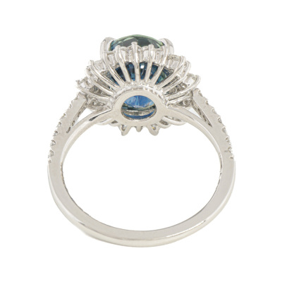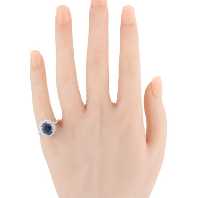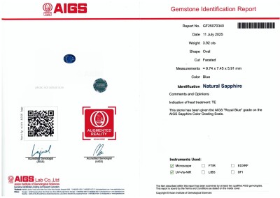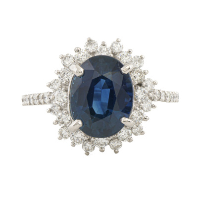 Sapphire and Diamond ring with centre oval shape Natural Blue Sapphire of 3.92ct (with AIGS Report #GF25070340) and round Natural Diamonds totalling 0.65ct (Estimated grading: G-H VS-SI). Platinum - 900. Ring size: J1/2. Band width: 1.3mm. Weight: 5.5g. (Pre-owned)
