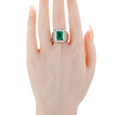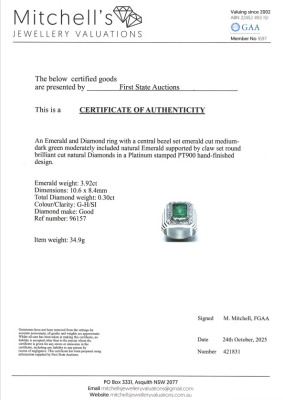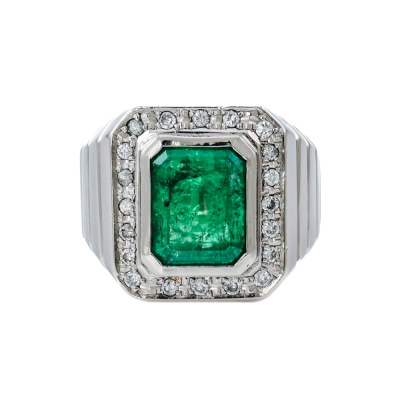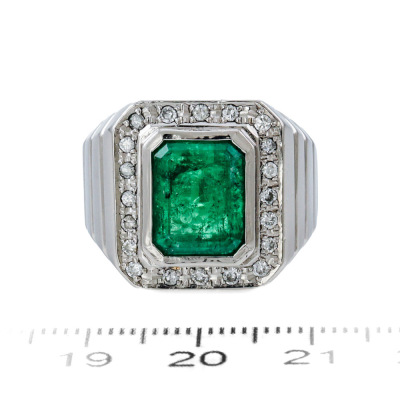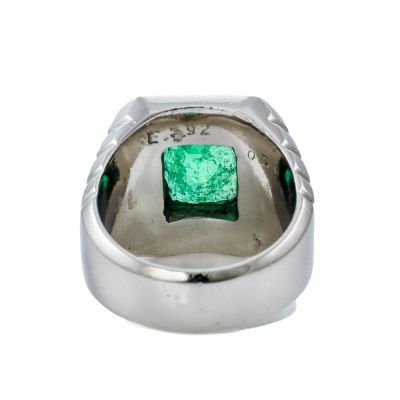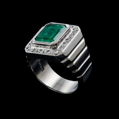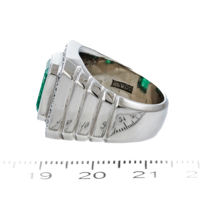 Mens ring with centre emerald cut Natural Emerald of 3.92ct and round Natural Diamonds totalling 0.30ct (Estimated grading: G-H SI). Platinum - 900. Ring size P1/4. Band width: 7.2mm - 9.8mm. Weight: 34.9g. With Certificate #421831. (Pre-owned)