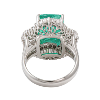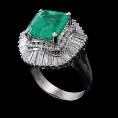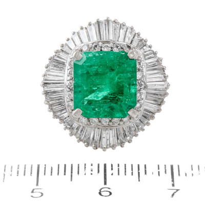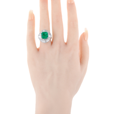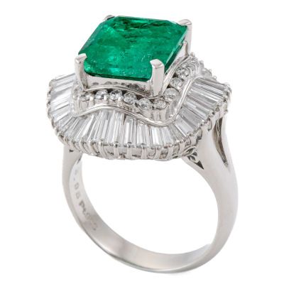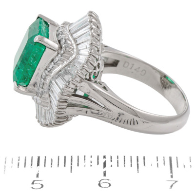 Emerald and Diamond ring with centre emerald cut Natural Emerald of 3.95ct and round & baguette cut Natural Diamonds totalling 1.49ct (Estimated grading: G-H SI). Platinum - 900. Ring size: K1/4. Band width: 3.4mm - 3.8mm. Weight: 13.1g. With Certificate #422304. (Pre-owned)