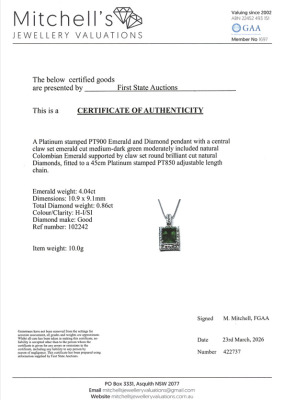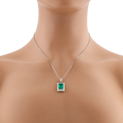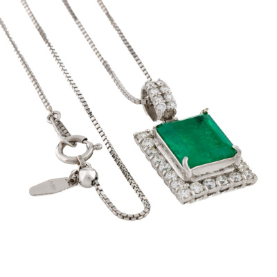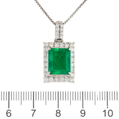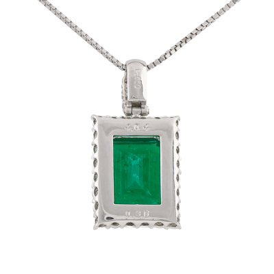 Emerald and Diamond pendant with centre emerald cut Natural Colombian Emerald of 4.04ct and round Natural Diamonds totalling 0.86ct (Estimated grading: HI SI). Platinum - 900 with 45cm Platinum - 850 adjustable chain With Certificate #422737.