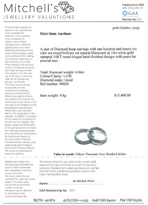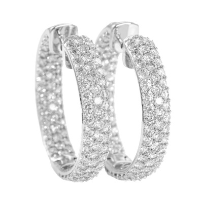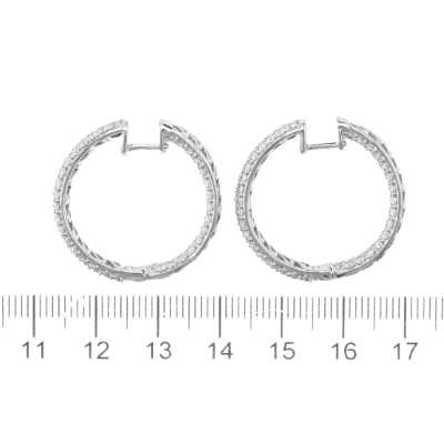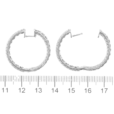 Diamond inside-out hoop earrings with 196 round Natural Diamonds totalling 4.04ct (Estimated grading: I-J SI). Each earring contains 55 Diamonds set on outside and 43 Diamond set on inside of hoop. 14ct white gold. Diameter: 2.7cm. Hoop width: 5.0mm. Weight: 9.8g. With Valuation Certificate #421874. (New).