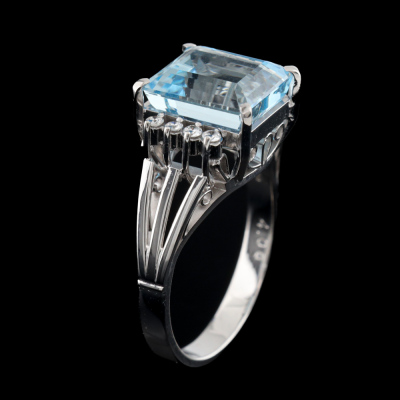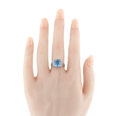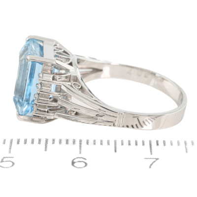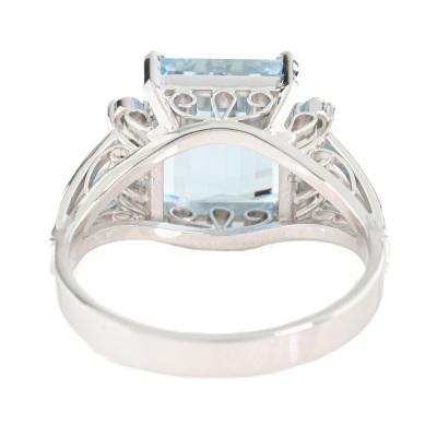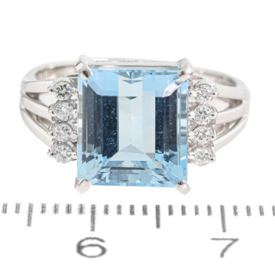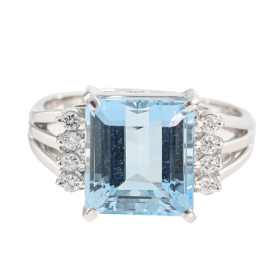 Aquamarine and Diamond ring with an emerald cut Natural Aquamarine of 4.06ct and round Natural Diamonds totalling approximately 0.16ct. 14ct white gold. Ring size M. Band width: 2.6mm-3mm. Weight: 5.2g. (Pre-owned)