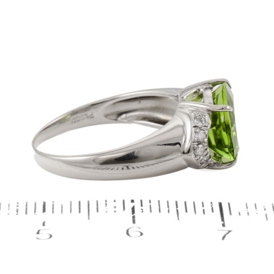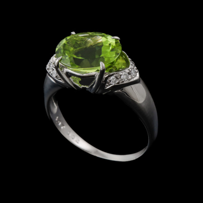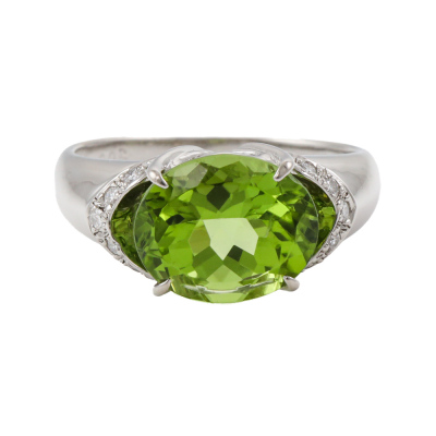 Peridot and Diamond ring with centre oval cut Natural Peridot of 4.07ct and 10 round Natural Diamonds totalling 0.10ct (Estimate Diamond carat weight, with stamped '0.02'). Platinum - 900. Ring size N 1/4. band width: 1.4mm - 4.5mm. Weight: 6.7g. (Pre-owned)