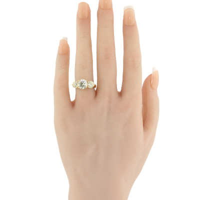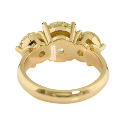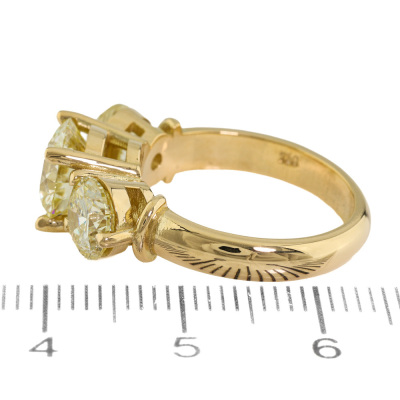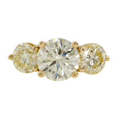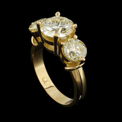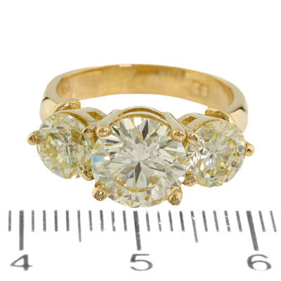 Diamond trilogy ring with 3 Natural Diamonds totalling 4.16ct. Centre round brilliant cut Natural Diamond of 2.13ct (with GIA Diamond Report graded as Q TO R SI1 #5533287567) and 2 round brilliant cut Natural Diamonds totalling 2.03ct (Estimated grading: Natural Light Yellow SI-P2). 18ct yellow gold. Ring size L. Band width 3.0mm - 3.5mm. Weight 7.5g (New)
