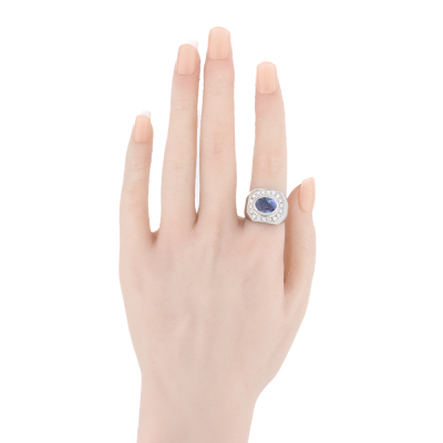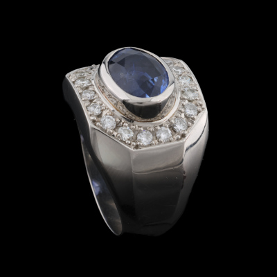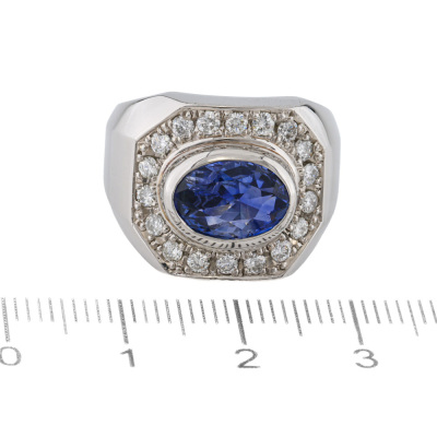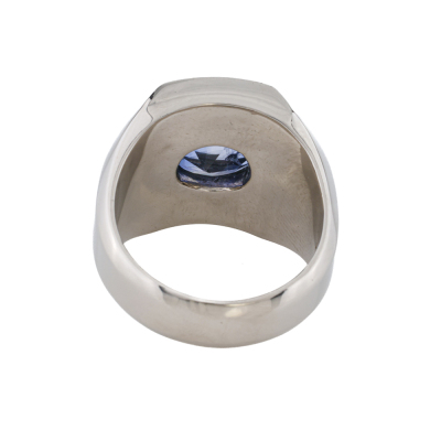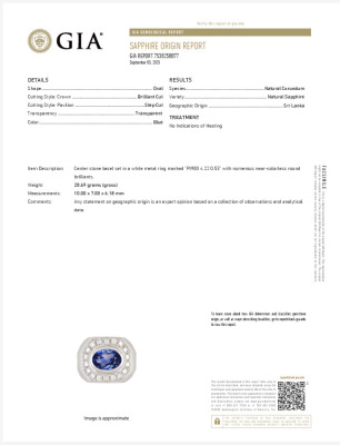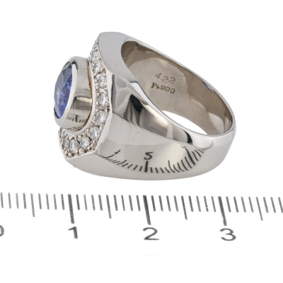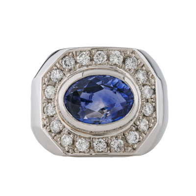 Mens ring with centre oval shape unheated Sri Lanka Natural Blue Sapphire of 4.22ct and round Natural Diamonds totalling 0.53ct (Estimated grading: G-H VS-SI). Platinum - 900. Ring size: M3/4. Band width: 5.8mm - 6.7mm. Weight: 28.7g. With GIA Report #7538258877. (Pre-owned)